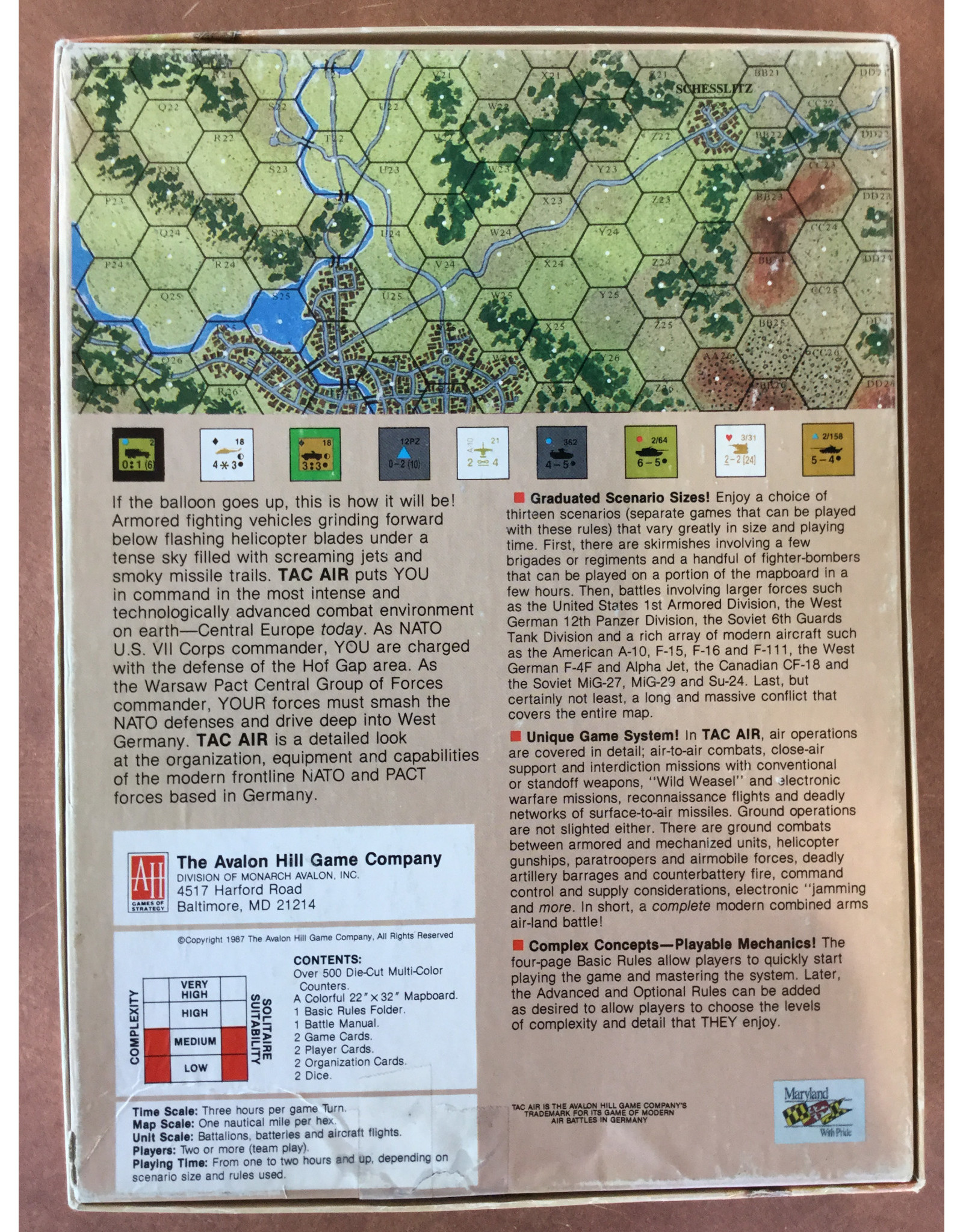 If the balloon goes up, this is how it will be! Armored fighting vehicles grinding forward below flashing helicopter blades under a tense sky filled with screaming jets and smoky missile trails. TAC AIR puts YOU in command in the most intense and technologically advanced combat environment on earth-Central Europe today. As NATO U.S. VII Corps commander, YOU are charged with the defense of the Hof Gap area. As the Warsaw Pact Central Group of Forces commander, YOUR forces must smash the NATO defenses and drive deep into West Germany. TAC AIR is a detailed look at the organization, equipment and capabilities of the modern frontline NATO and PACT forces based in Germany.
